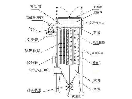 其結(jié)構(gòu)主要由過濾室、濾袋、凈氣室、灰斗、卸灰閥、脈沖噴吹清灰裝置、電控箱組成,箱體全部采用焊接結(jié)構(gòu)。檢修門用泡沫膠條密封,_除塵器嚴(yán)密不漏風(fēng)。